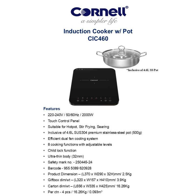 Cornell Induction Cooker 2000W with Premium Stainless Steel Pot CIC460